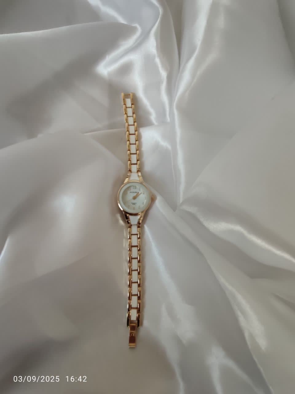 ساعت مچی دخترانه سفیدو طلایی سرامیکی بسیار زیبا جنس استیل و سرامیک با صفحه سفید و اعدادطلایی بند قابل تنظیم